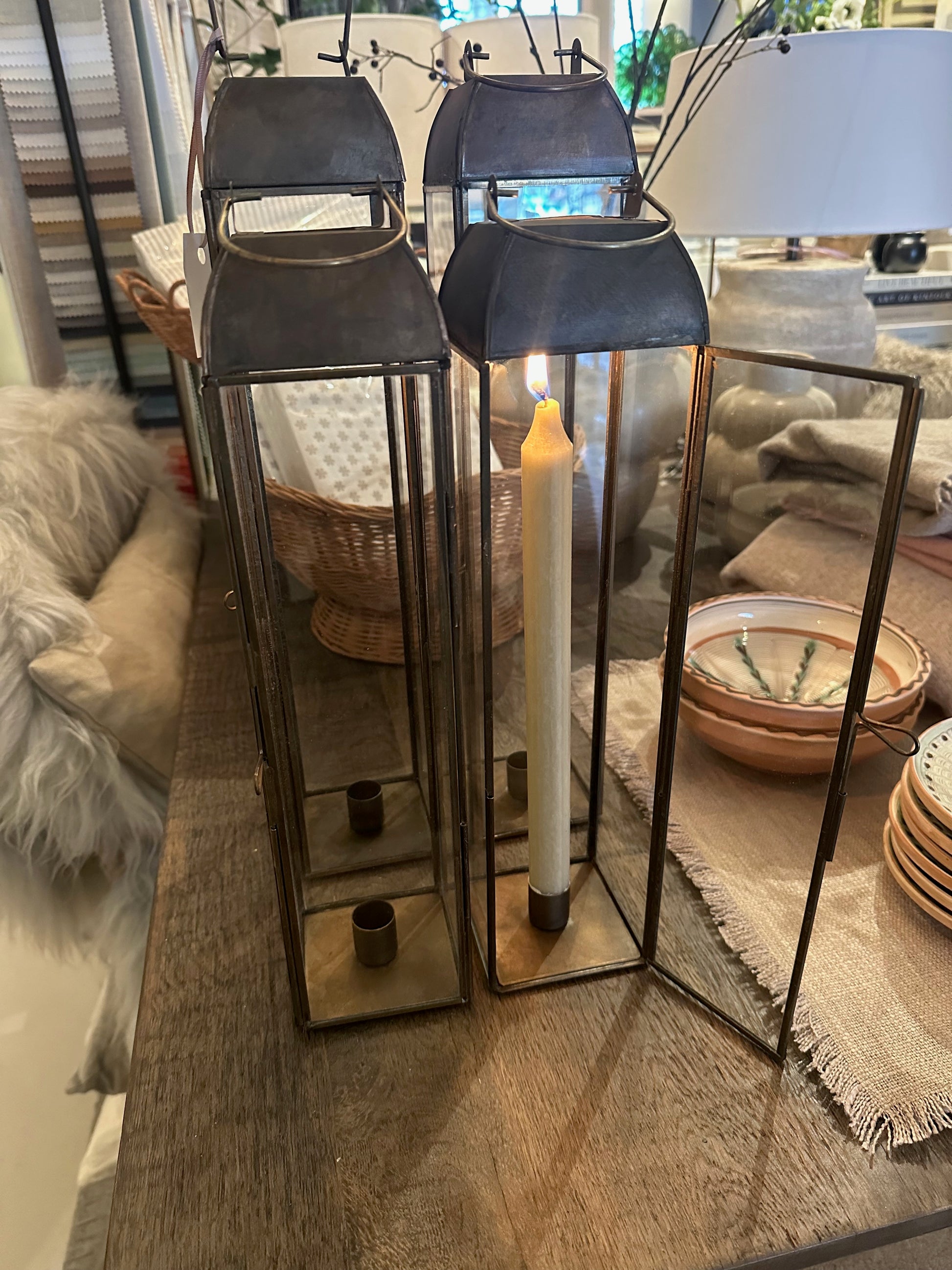 Høje slanke lanterner i oxideret metal. Meget charmerende - også i grupper. Fås i 2 størrelser. Passer til et alm. kronelys/stagelys.