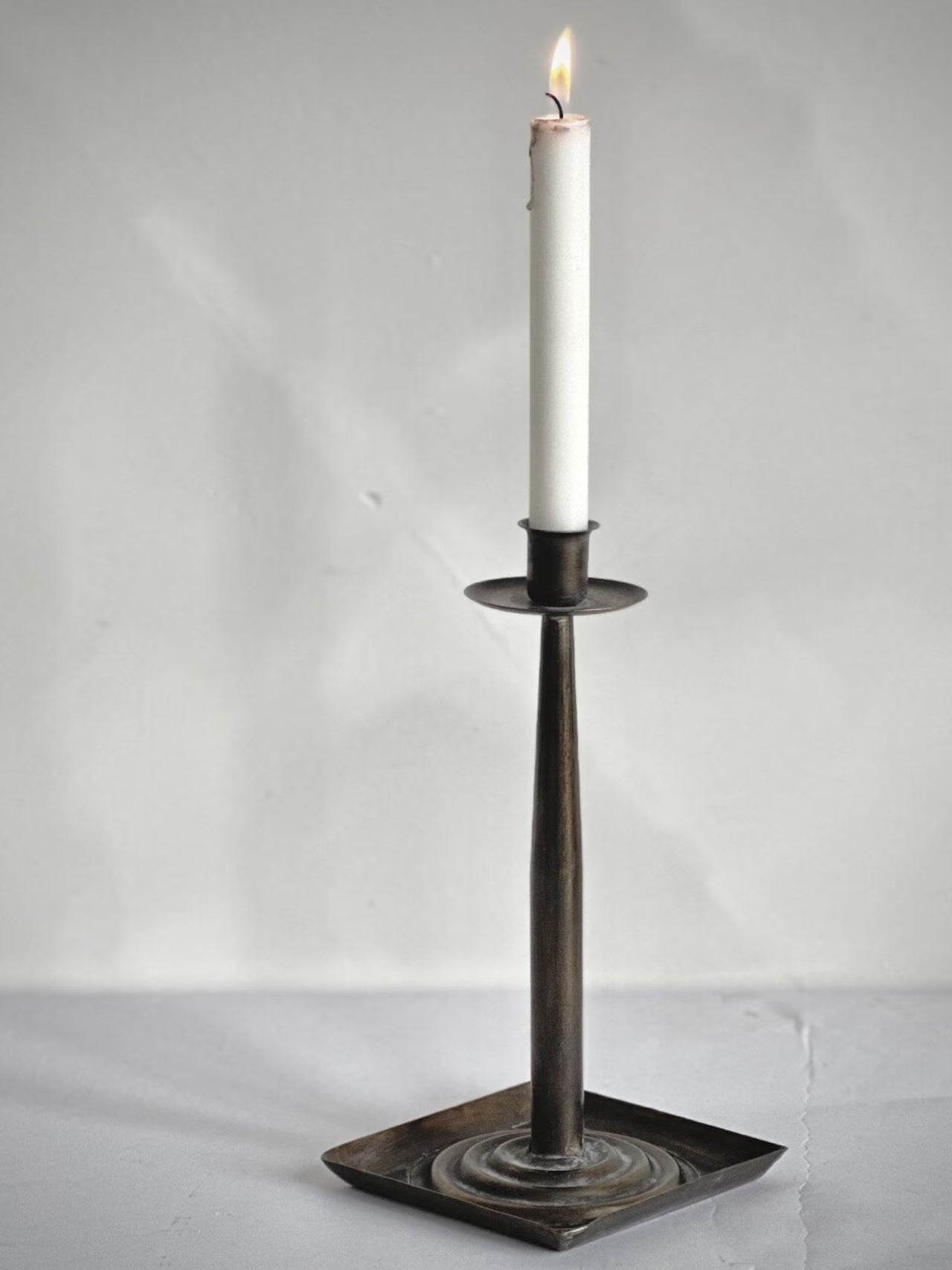 Lysestage i bruneret messing. Måler 13x13 x H 26 cm.