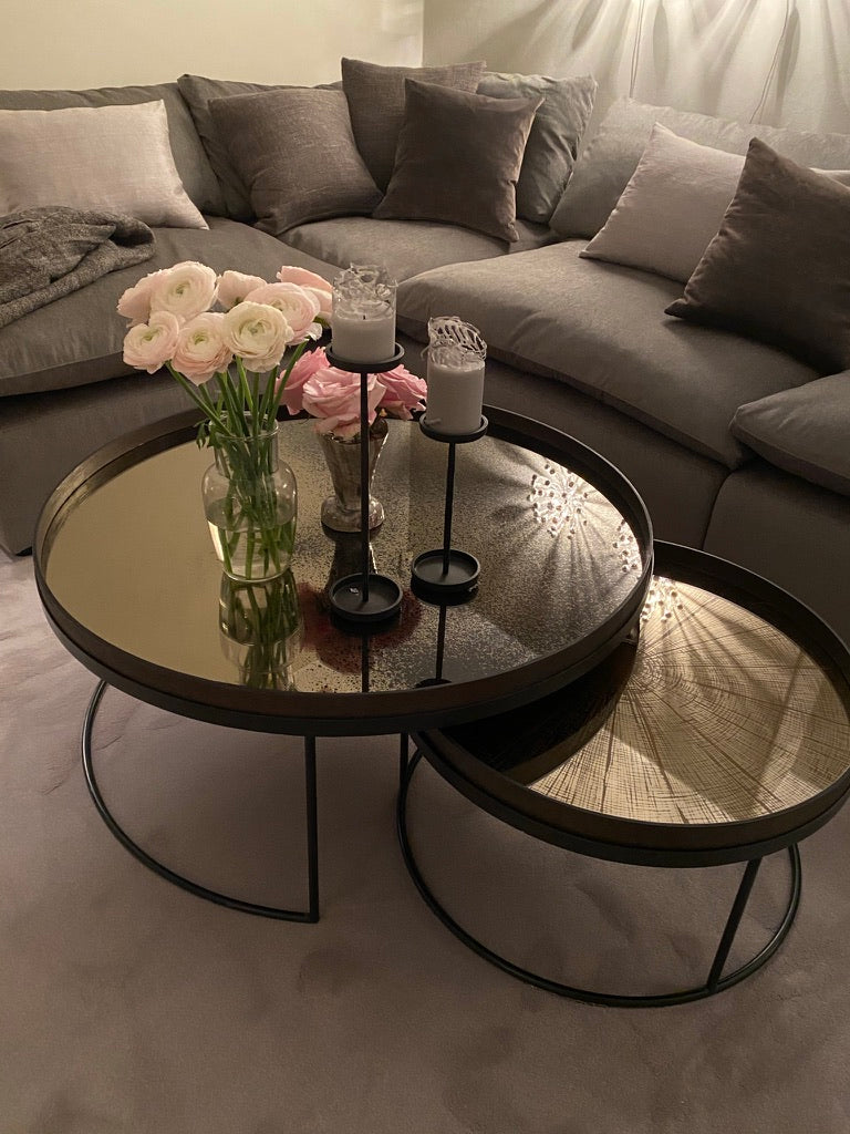 Eksklusivt sofabord sæt med spejlbakker. Ø90 cm og Ø60 cm. H 43 cm.